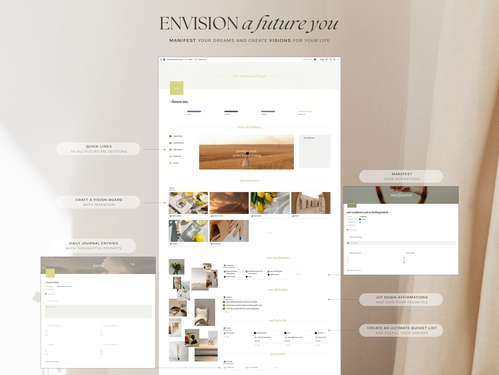 ✦Future Me Dashboard (vision board, manifestations, affirmations, bucket list, and journal sections)