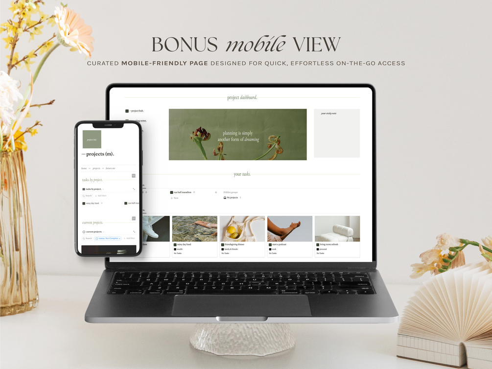 You'll get: An instant-download PDF with a link to your Notion Life Planner, featuring a: ✦Home Dashboard ✦Agenda Dashboard (daily, weekly, monthly and annual agendas sections) ✦Project Dashboard (project hub, meeting notes, and documents sections) ✦Future Me Dashboard (vision board, manifestations, affirmations, bucket list, and journal sections) ✦Mobile Planner (designed specifically for mobile use!)